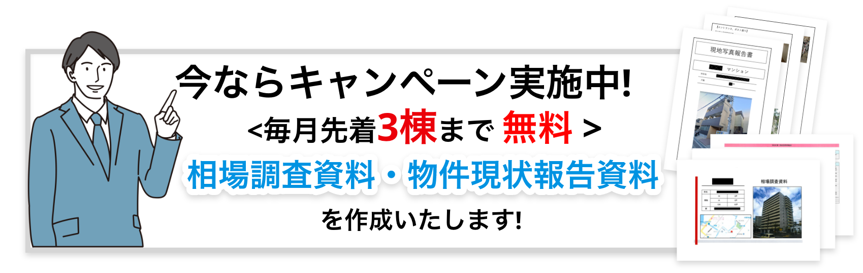 毎月3棟まで無料で相場調査資料・物件現状報告資料を作成いたします!