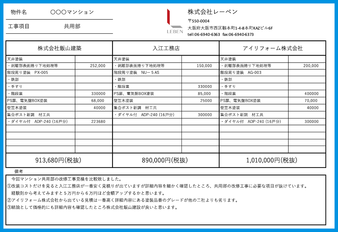 当社では複数の施工工事会社に相見積もりを依頼し、各社の工事明細の見積もりを元にメリット・デメリットなどを記載し、オーナー様にご提案いたします。工事会社からの見積もりはそのままご提示させていただきますので当社の利益を上乗せすることはありません。>工事中は、最初から完了までチェックしご報告いたします。疑問に感じられたことはすべて正確・誠実にお答えします。